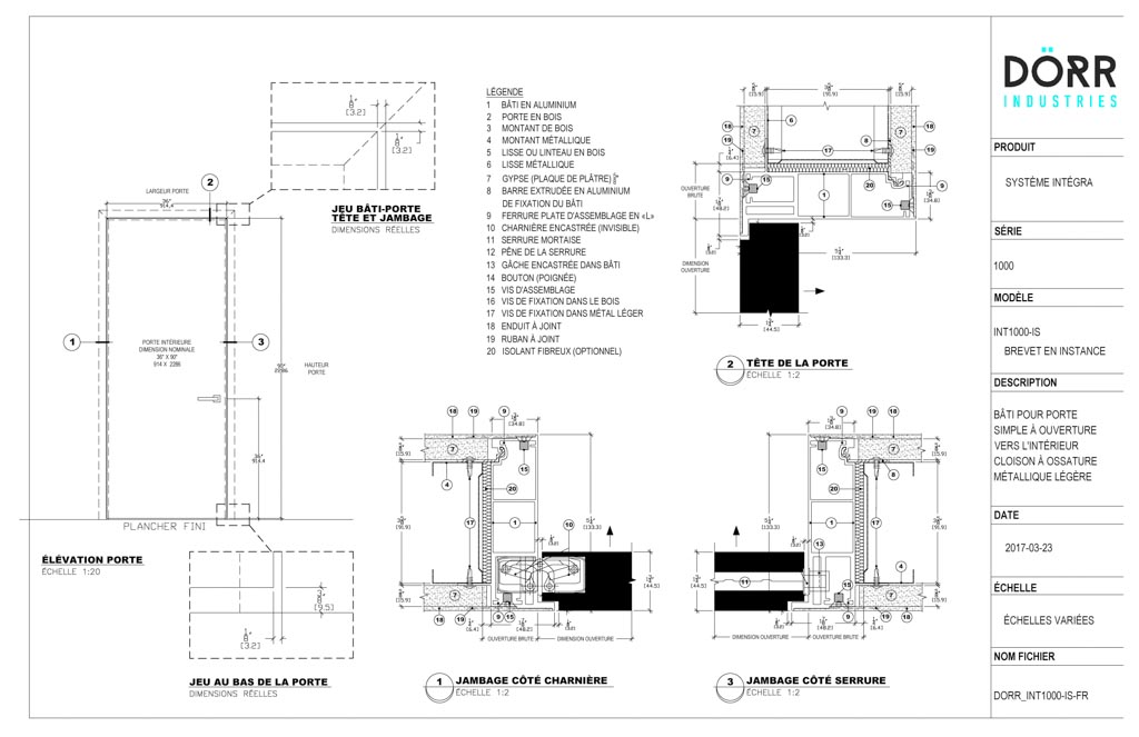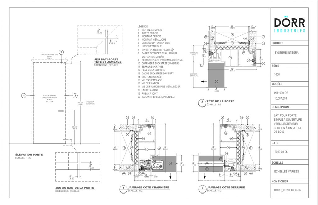 Le cadre de la série 1000 s’installe exclusivement avec des cloisons de 2×4. L’avantage notable de cette série est que le cadre couvre les deux côtés de la cloison, offrant un effet « FLUSH » des deux côtés de votre mur. Pour un look encore plus minimaliste et épuré, optez pour la série 1000 avec l’option sans tête (porte plancher/plafond).
